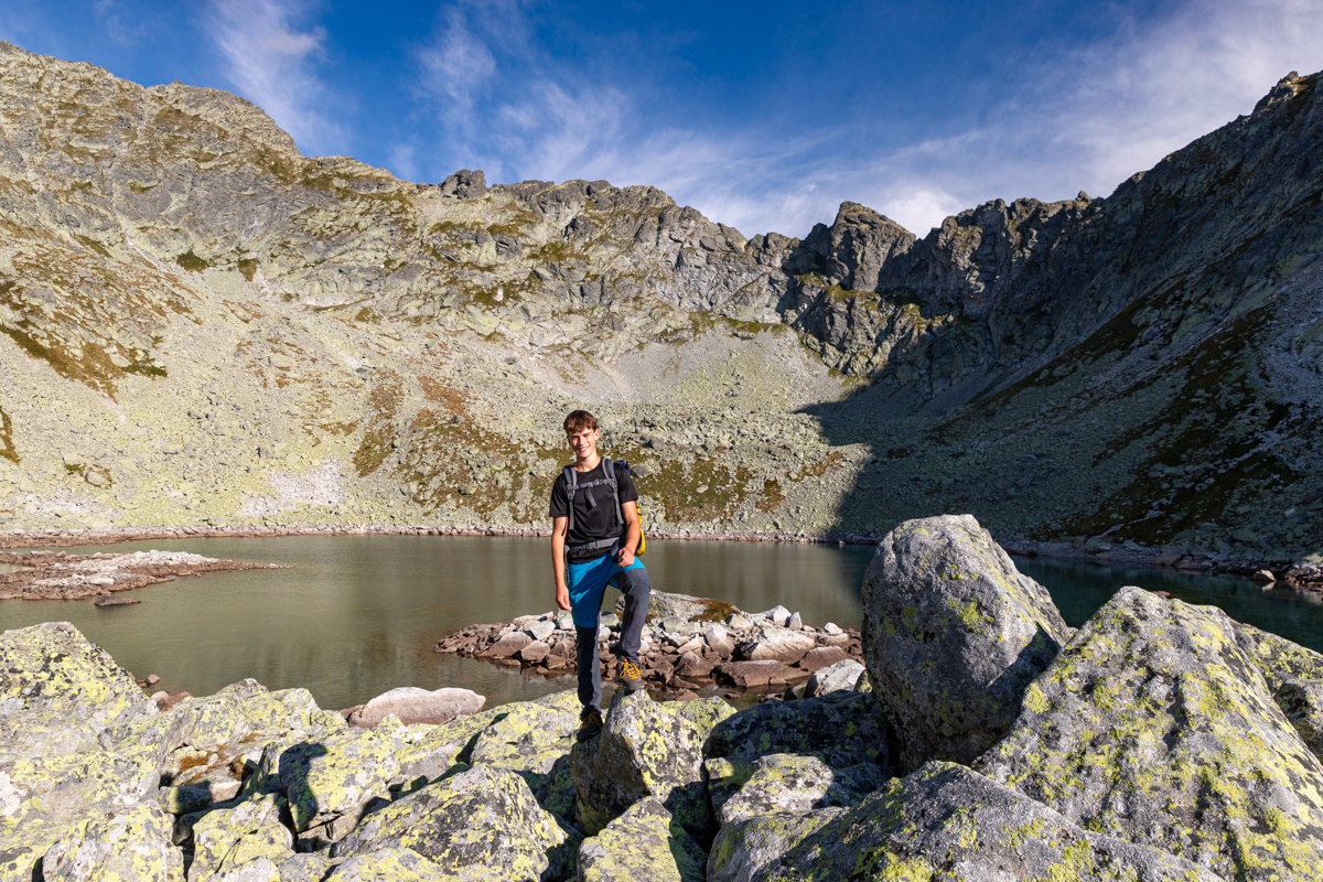 U Plesa nad Skokom (1800 m n. m.) přebalujeme batohy – na záda jen to nejnutnější, zbytek schováváme pod kámen.