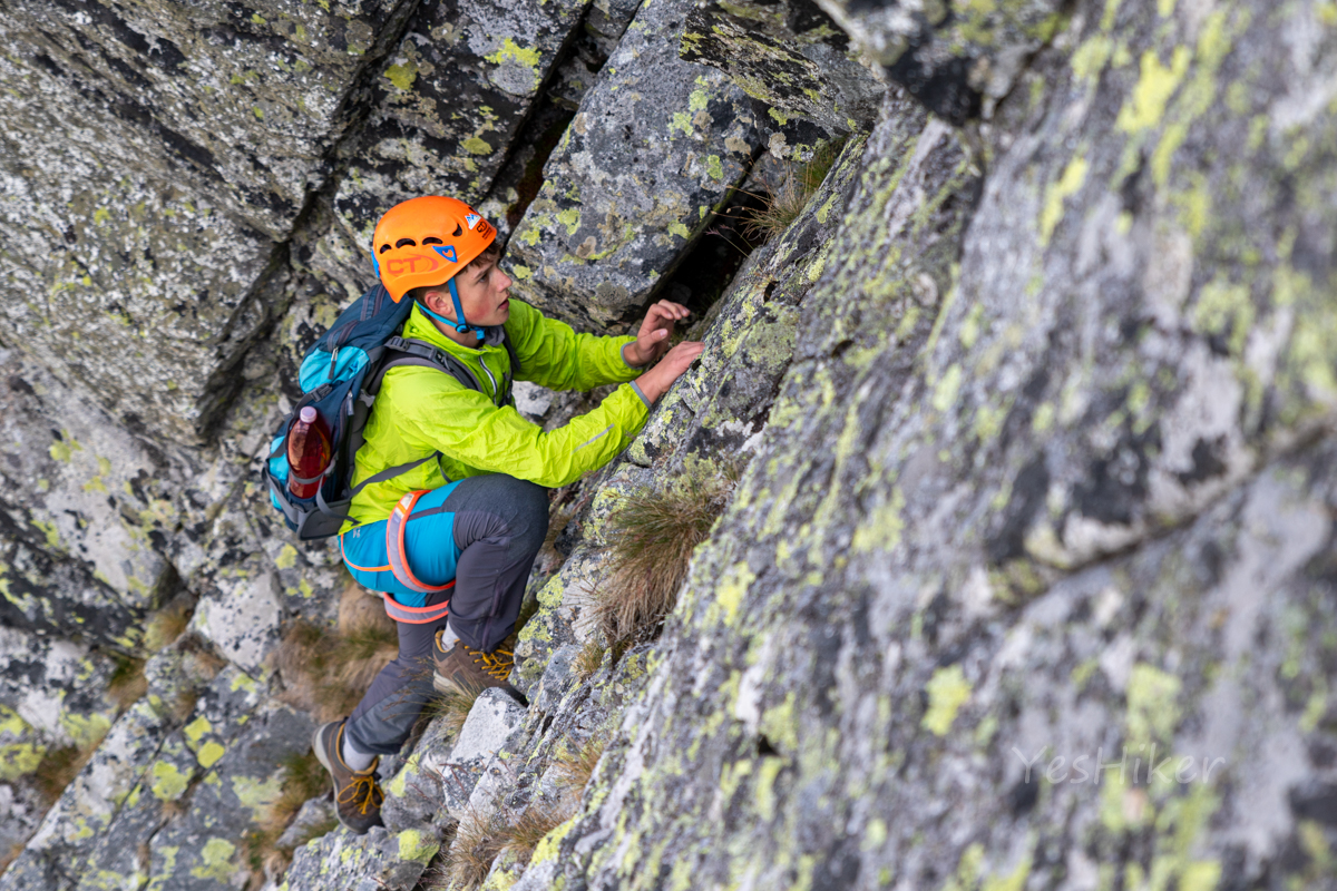 Odtud už nás čeká další snadný výšvih na Zadnú Baštu (2379 m n. m.), delší úsek po hřebeni do Diablovho sedla (2319 m n. m.), a dál na Zlatinskou vežu (2350 m n. m.). Ze Zlatinské štrbiny (2335 m n. m.) pak první vážnější lezecký úsek – Diablovina (2390 m n. m.). Nic extrémního, ale expozice tu dokáže potrápit.